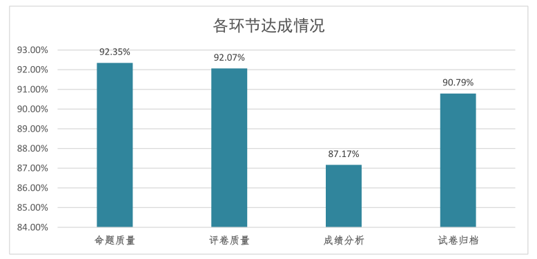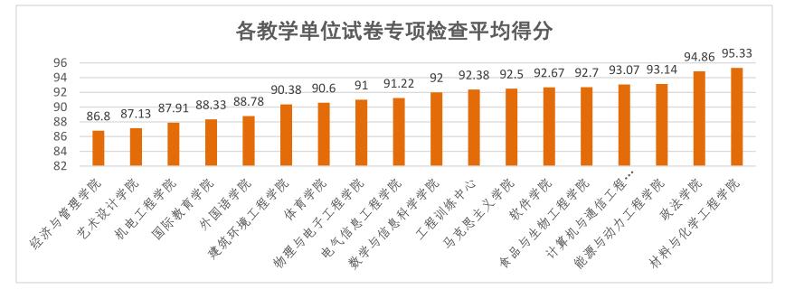 自2018年,学校连续三年聘请校内外专家对课程试卷材料进行了专项检查。经过几个轮次的检查和整改,各教学单位的试卷工作管理水平和试卷命题、评阅质量有显著的提高,抽查的18个教学单位中,15个教学单位的平均分都在90分以上,各教学单位对试卷材料的管理、归档存放更加规范,大部分教学单位能够迅速完成材料调取,按时送交检查,试卷的命题、评阅、分析的规范性有很大提高,其中,试卷命题相对其他工作表现较好,平均达成度为92.35%,但成绩分析整体得分较低,平均达成度为87.17%,存在问题较多,仍有很大提升空间。某学院材料调取相对滞后且未按要求交齐材料,截止本次检查结束前,学院2018—2019学年的材料仍未归档到位,任课教师2019—2020学年第一学期材料仍未整理齐全。