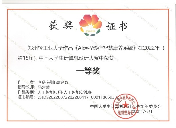 2 | AI远程诊疗智慧康养系统 | 李琎、崔灿、高金奇 | 全国一等奖 | 马建荣 |