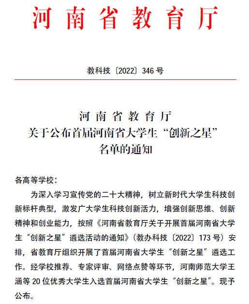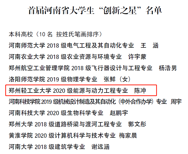 近日,河南省教育厅组织开展的首届河南省大学生“创新之星”评选结果公布,经学校推荐、专家评审、网络点赞等环节,我校2020级能源与动力工程专业陈冲同学获得首届河南省大学生“创新之星”荣誉称号(全省本科高校10人),这一成绩充分体现了我校大学生优秀的科技创新创业能力以及良好的科技创新创业氛围。